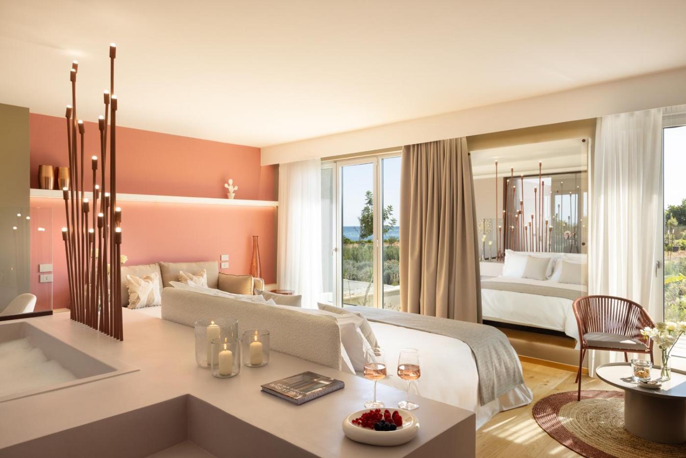 Junior Suite con Vista Mare. This suites special feature is the hot tub. The air-conditioned suite features 1 bedroom and 1 bathroom with a walk-in shower and a bath. Featuring a balcony with sea views, this suite also provides soundproof walls and a flat-screen TV. The unit offers 1 bed. ;