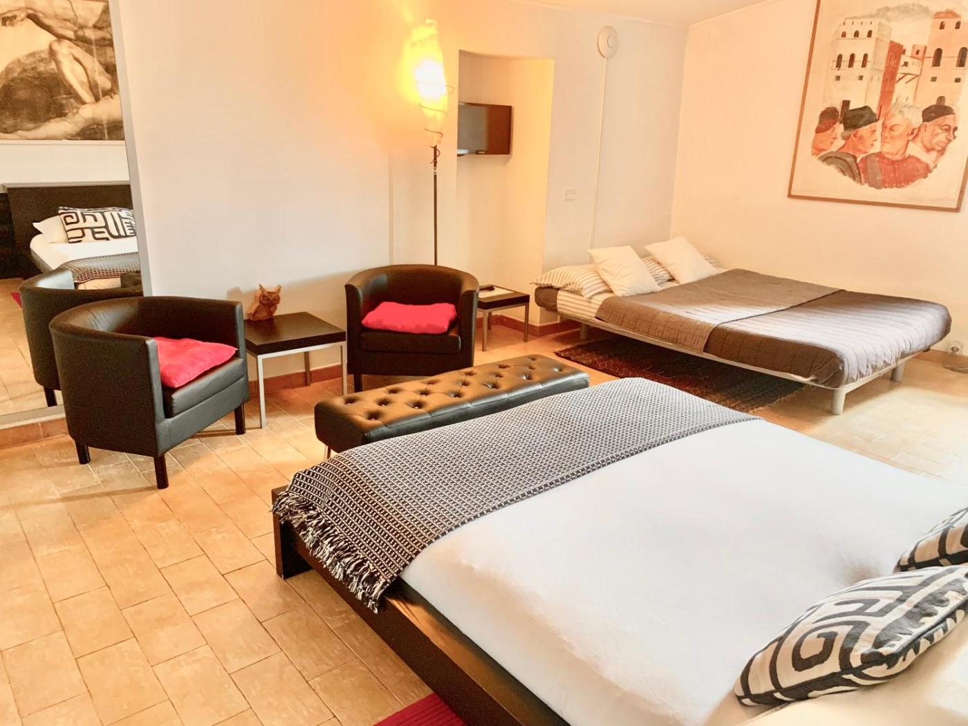 Camera Quadrupla. Camera con WiFi gratuito, TV satellitare e bagno privato munito di doccia con radio e funzioni per massaggiare i piedi. Questa ampia sistemazione si affaccia sul cortile interno o sulla cittĂ e presenta soffitti a volta con travi di legno a vista. ;