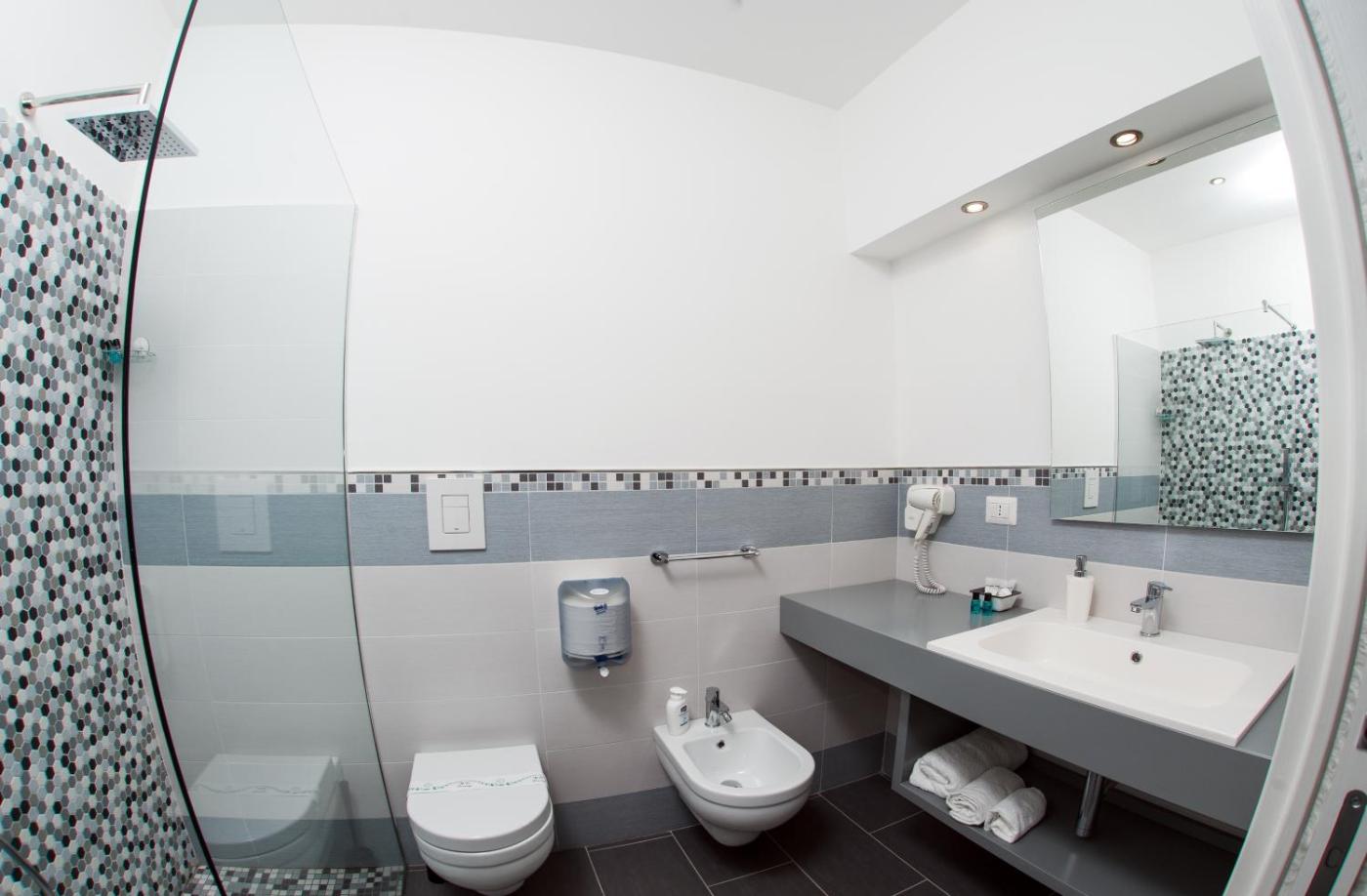 Camera Quadrupla con Bagno Privato. In the kitchen, guests will find a stovetop, a refrigerator, kitchenware and a microwave. This air-conditioned quadruple room is comprised of a flat-screen TV with cable channels, a private bathroom as well as a terrace with city views. The unit has 3 beds. ;
