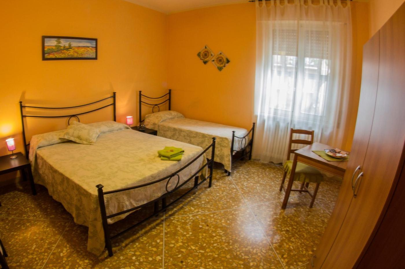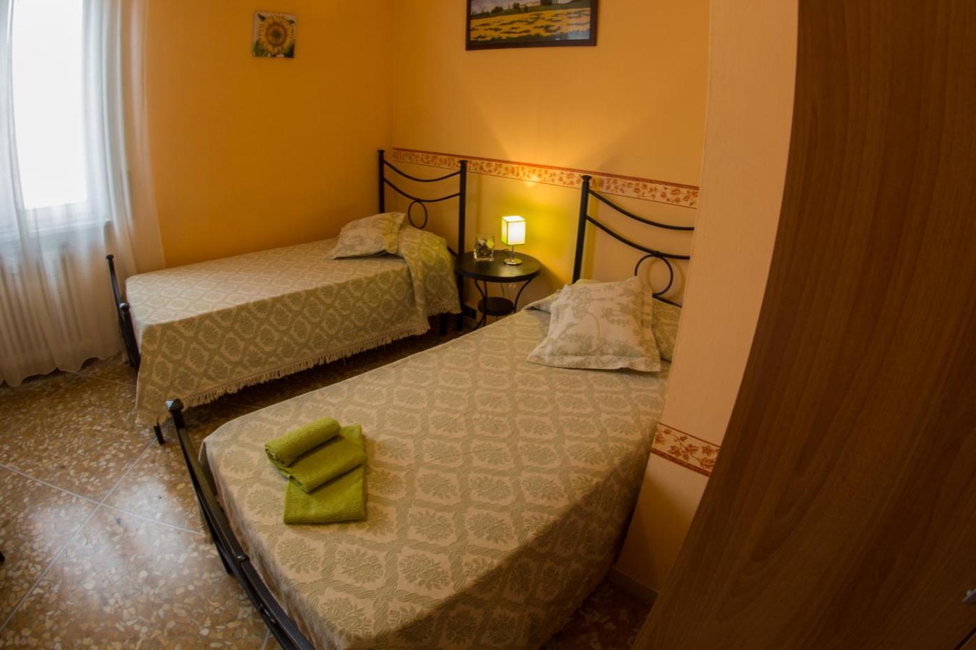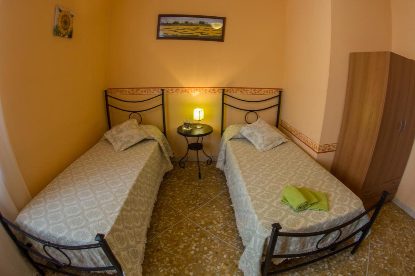 Camera Doppia con Letti Singoli e Bagno in Comune. Tutte le camere sono dotate di connessione WiFi gratuita, arredi semplici e pavimenti piastrellati.