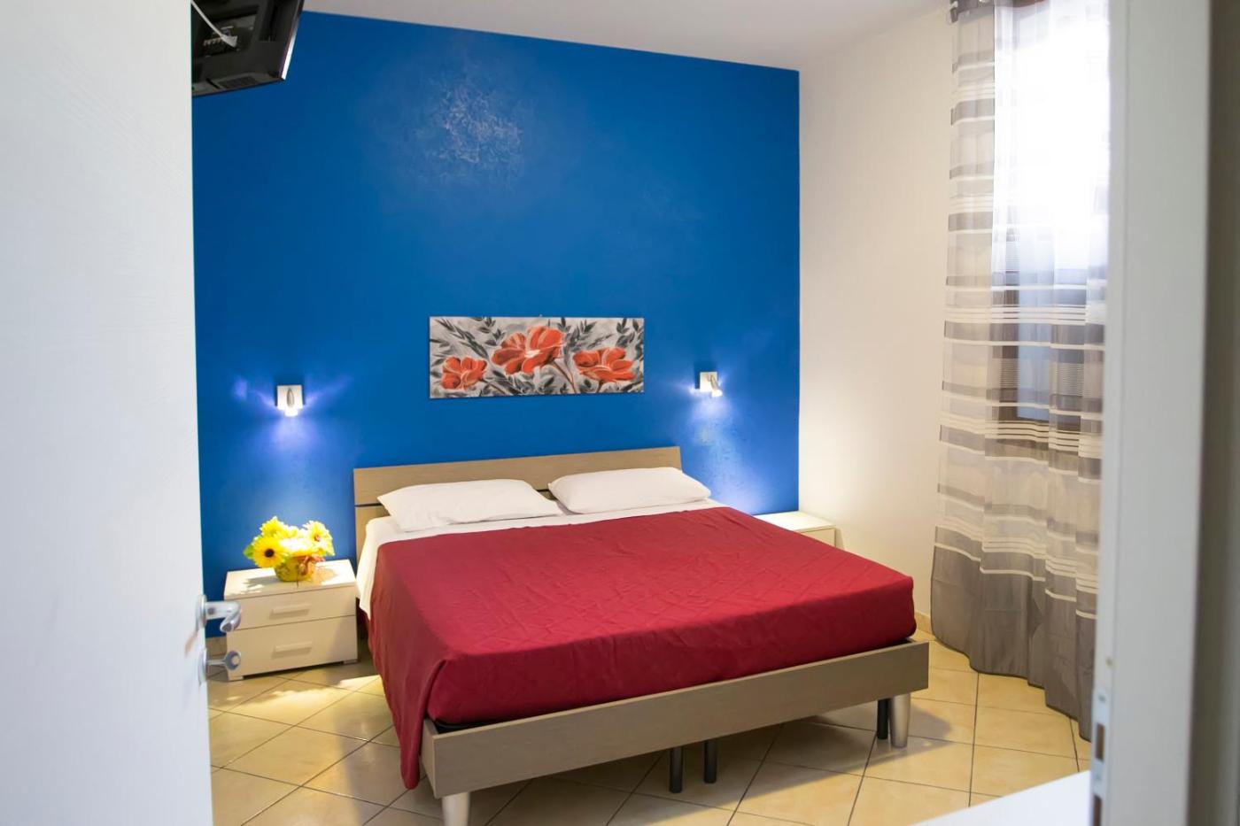 Camera Matrimoniale. Camera in stile moderno con TV a schermo piatto, connessione Wi-Fi gratuita e aria condizionata. Il bagno privato è completo di asciugacapelli edi cortesia.
